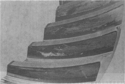 表面硬化弧齒錐齒輪大輪工作齒面的表層壓碎。在輪齒上可看到大量的與小齒輪齒面接觸線方向一緻的裂紋。一齒面上有大量材料脫落,形成一大的凹坑。 |