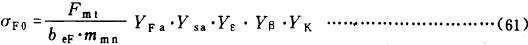 齒根應力基本值σF0是以載荷作用於齒頂爲計算基礎,然後利用重合度系數Yε,将齒頂加載時名義齒根應力轉換爲單對齒齧合區上界點加載時的值,再考慮螺旋角的影響及錐齒輪特點後得出的。由下式確定 :