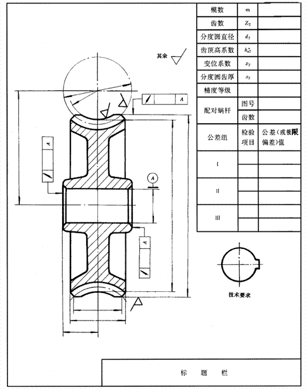 蝸杆、蝸輪圖樣的繪制應符合GB4459.2的規定。圖樣中的參數表一般放置於(yú)圖面的右上方,參數表中列出的數據項目可根據需要增減,檢驗項目則按使用要求和用戶意見根據GB10089和有關标準的規定確(què)定。圖樣的技術要求一般放置於(yú)圖面的右下方。
