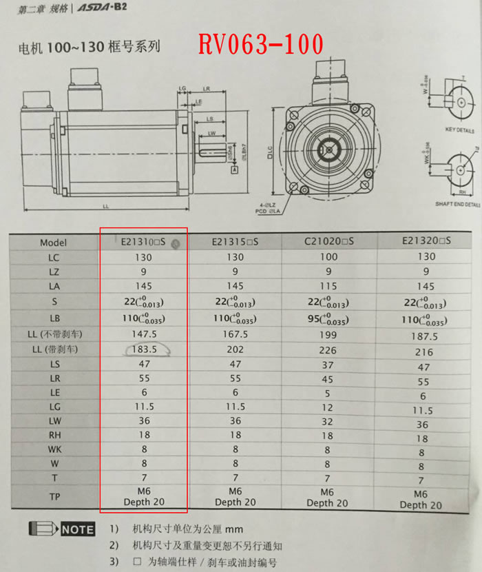RV63蝸輪減速機配伺服電機法蘭實物照片,減速比1:100,並附伺服電機尺寸表