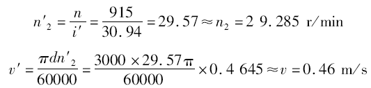 查表A1,選取MQ滿足不等式Mjmax≤MQ≤Mmax的型号,選取YZX132M242,其MQ=2903 N·m電機轉速n=915r/min,實際傳動比i′=30.94(表A2)。
