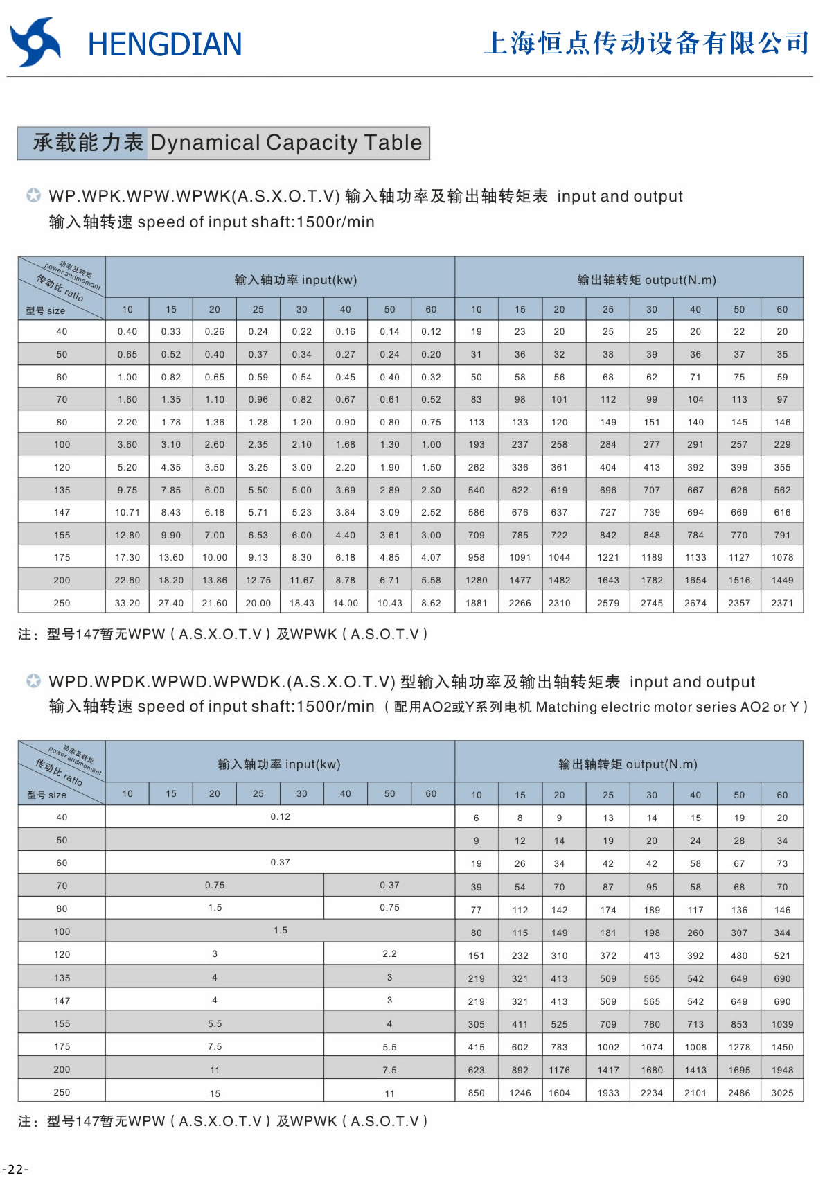 WP鑄鐵蝸輪蝸杆減速機,配置方式靈活,具有一定的自鎖能力,能适應多種安裝和使用的要求,因此使用範圍廣泛 。但蝸輪蝸杆減速機本身的傳動效率不高,不如行星減速機或者齒輪減速機,所以在選用時要多方考慮。下面恒點減速機把這類減速機的承載能力表公布下,以便大家查閱: