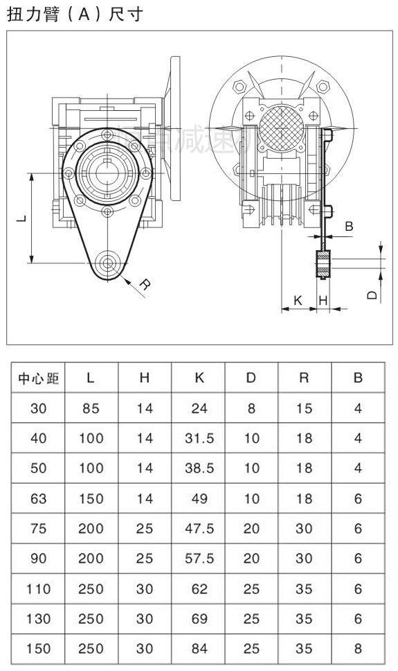 RV系列減速機的扭力臂的外型尺寸表,詳細的見下圖表: